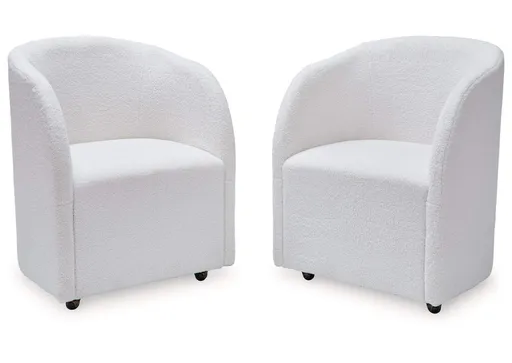 Inspired by art deco design, the fully upholstered Rowanbeck dining chair makes a lasting impression in a simply stunning way. Its magnificent curved silhouette is enhanced with a neutral boucle upholstery that’s so pleasing to the palate. This is the piece you’ve been looking for to elevate your contemporary decor whether you’re dining, listening to your latest playlist or binge-watching with friends. Plus, it’s set on casters so it’s easy to move around.