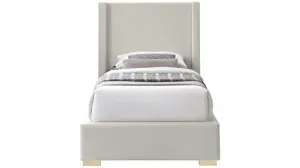Royce Bed is the star of the show here, with its extra height adding an element of drama to this exceptionally crafted bed. The headboard, sides and footboard of this Royce bed are covered in rich beige linen textured fabric for a sleek yet chic touch. The bed comes with both gold and chrome legs to suit your style preferences.