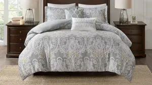 The Hallie queen 6-piece comforter set introduces an elegant and traditional allure to your bedroom decor. Flaunting a beautiful damask pattern in gray hues, the oversized and overfilled cotton comforter provides incredible softness and comfort. A solid gray reverse complements the top of the bed, while hidden bartacks give the comforter a duvet-like finish. Two cotton shams reiterate the damask print seen on the comforter to create a beautiful coordinated look. To complete the bedding set, two Decorative pillows with embroidered details and a solid gray bed skirt provide the finishing touch. Made from soft cotton sateen, this comforter set will easily transform your bedroom into a stunning and lavish retreat.