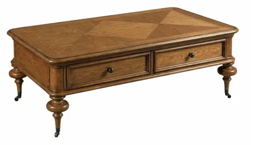 The Pearson rectangular coffee table is crafted of hardwood solids with a beautiful diamond cut hickory veneer patterned top. This piece offers a traditional style yet casual feel for any living space. It has two drawers for ample storage space. It also has removeable caster for easy mobility.
