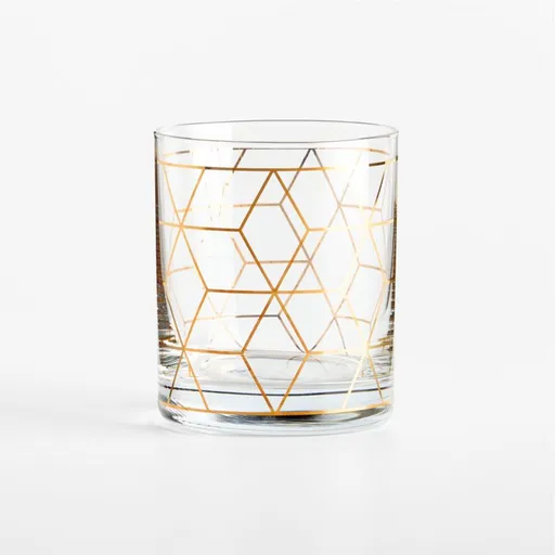 Fine-lined gold hexagons pattern this clean-lined rocks glass with sophisticated, Art Deco-inspired style. For a coordinated cocktail hour, pair with our Jaxson decanter. Due to its handcrafted nature, each double old-fashioned glass will be slightly different.