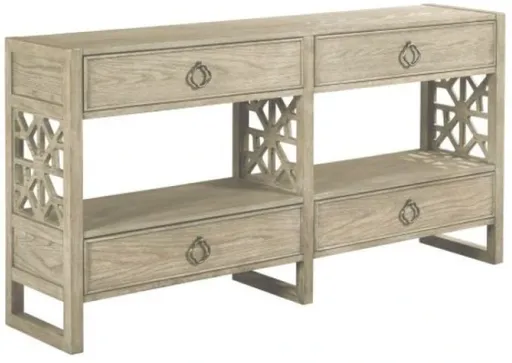 Vista is a casual transitional collection, utilizing everyday transitional styling and incorporating it with some seemingly casual elements and accent pieces. Hall console with geometric grids in the ends, four drawers for storage and two shelves for display make it a beautiful piece for any room.