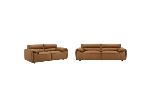 Refined and sculptural, this leather sofa set blends modern minimalism with deep, enveloping comfort. Upholstered in 100% genuine top grain leather, each piece features wide, gently sloped arms and a low-profile frame that grounds the room with effortless presence. Deep seat cushions are filled with high-density full foam and supported by sinuous springs, creating a balanced feel thats both structured and soft. Tailored yet inviting, this two-piece set is crafted to elevate comfort with enduring sophistication.