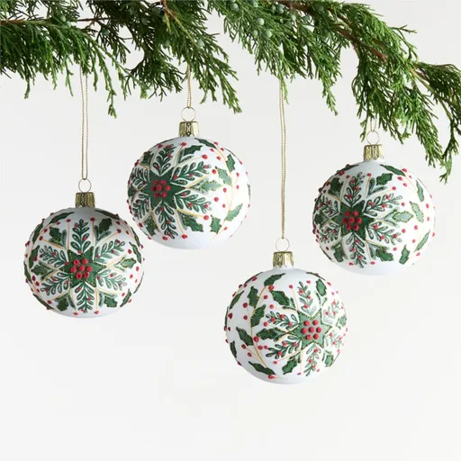 Our holly ball ornaments dress your tree with exquisite artisanship. Hand-blown by talented craftspeople, the glass spheres are painted by hand with green foliage, golden stems and ruby-like holly berries on snow-white. Glitter details sparkle in the glow of string lights. These four gorgeous ornaments are perfect for a formal tree with Old World glamour.