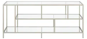 A must-have for living areas and entertainment spaces, this Zinnia TV stand with glass shelves sets the stage for the big game, a movie marathon, or that season finale everyone's been talking about. Crafted from steel, it strikes a clean-lined silhouette and boasts a metallic finish and tempered glass shelves for a look that blends with nearly any color palette.