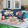 Get lost in the oversized comfort and structurally sound furniture of our exclusive Fairmont Collection. Feel the cool touch of the handmade aluminum frame, featuring a multi-step powder-coated and oven-baked clear coat finish. Each piece in this 4 piece swivel loveseat group is constructed by laser welding to create fully welded and braced frames with zero weld marks. The loveseat and swivel club rockers feature PVC sling seat suspenion and include oversized deluxe Sunbrella® acrylic cushions. The textilene material's flexibility and sturdiness make it a comfortable material for seating. The 31 in. round coffee table features a travertine stone design comprised of concrete with a rib finish.