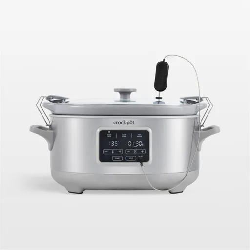 This dual-function appliance combines the convenience of a slow cooker with the precision of a sous vide machine. For braising, simmering and stewing, the generously sized seven-quart stoneware pot slow cooks larger cuts of meats and prepares family-sized dishes with timer settings that program cooking times up to 30 hours. The sous vide function creates a temperature-controlled water bath to cook foods in airtight bags to juicy perfection. A removable temperature probe makes sure everything is perfectly prepared, no under- or overcooking.