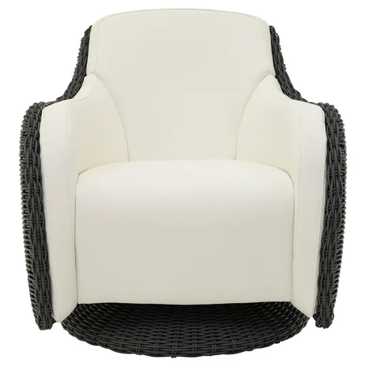 Get all-weather comfort with the Luxor Gray Swivel Accent Chair for your patio. With pure white MarinaPLUS synthetic leather with an ultra-plush feel, you can sit back and swivel on the cushions as you relax in your own backyard while the pebble gray HDPE resin wicker and aluminum construction make sure this chair is long-lasting for you to enjoy this chair for years to come.