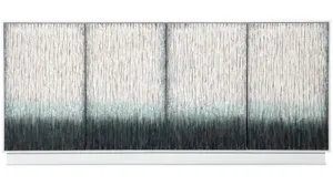 Melange Credenza has four white and blue ombre-colored textured door fronts. The interior and case of the credenza is in a soft white. There are two adjustable shelves behind each pair of doors and a 3-plug outlet behind the left pair of doors in the upper right corner. Crafted of Pine and Maple Veneers, the credenza accommodates up to a 75-inch TV.