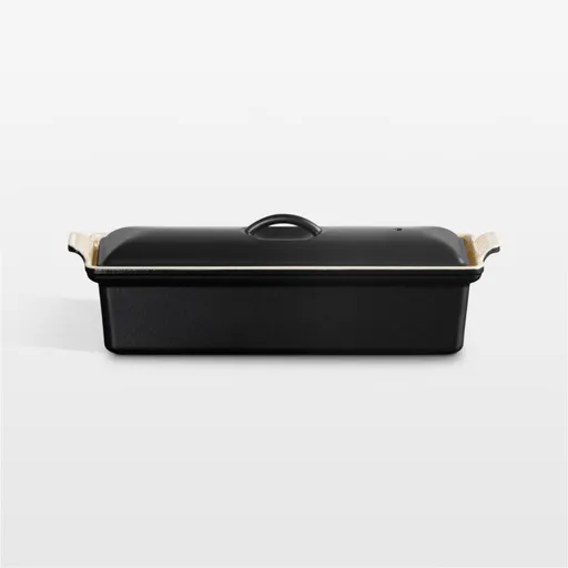 Made with high walls and a tight-fitting lid, this pan is designed to mold and slow cook terrines for a compact, evenly cooked and sliceable loaf. Like LeCreuset's famed cookware, the pan is made of cast iron with excellent heat retention and distribution. The enamel glaze in licorice-inspired black makes the pan impervious to stains and odors and chip-, crack- and scratch-resistant. Try your hand at a classic terrine or use the pan to bake bread, custard, lasagna or meatloaf.