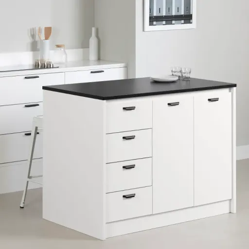 The Amaro white and black stone-look melamine kitchen island with built-in storage will make you want to get out your pots and pans and start cooking! Whether you live in a house, a condo, or an apartment, this kitchen island has 4 drawers on metal runners and 2 doors with a removable shelf behind them. The melamine surface of this kitchen island is designed to last and is water and scratch-resistant, but also easy to clean. Cook with confidence without worrying about damaging your furniture. Available for Online Purchase Only. Ships Directly from the Manufacturer. RC Willey Delivery is Not Available. Assembly required.