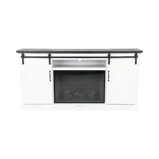 Upgrade your living room furniture with this traditional farmhouse style TV stand! The sliding barn doors allow access to your closed storage, keeping media consoles and more neatly tucked away. The solid mahogany wood is finished in a crisp, bright white with a natural brown tabletop that will easily fit in with any home decor style you have. Heating up to 1000 Sq Ft, the adjustable fireplace adds just the right amount of warmth and coziness to any home. Add your favorite TV and you'll be ready for your next movie night!