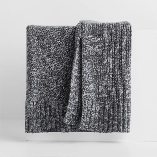 A trio of knitting stitches unite in a throw blanket with a wealth of texture and coziness. Durable acrylic yarn in dark grey lends warmth to autumn and winter decor, pairing effortlessly with a palette of neutrals, colorful patterns or bold blacks and whites. Evoking the cuffs of a favorite sweater, the wide-ribbed border finishes the throw with a graphic striped pattern. Drape our exclusive grey sweater-knit throw blanket over the arm of a sofa or the foot of the bed so indulgent warmth and comfort is always right at hand.