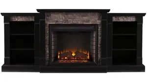 Set your heart aflame with the Harrow Bookcase electric fireplace. The Bookcase storage shelves media, novels, or tchotchkes. Satin black melds with simulated black river stone for a rustic touch on this traditional fireplace silhouette. Low profile and wide scale, this electric fireplace with bookcases turns on chic style beneath your wall mounted TV in the living room or as a sleek buffet in the dining room.