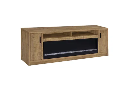 This expansive fireplace media console delivers the perfect fusion of storage and style for spacious living areas. A wide electric firebox rests atop a bed of glistening crushed acrylic crystals, offering fifteen flame color options controlled by a wireless remote. Dual open cubbies provide easy access to devices, while two cabinet doors conceal adjustable shelves for flexible storage. Crafted from engineered wood with a mango-tone laminate veneer, each compartment includes rear cutouts for wire management. Please note that this console does not include a heat function.