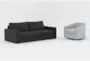 Introducing the Araceli II Charcoal Grey Vegan Faux Leather 95" Sofa and Carlisle Fabric Swivel Barrel Arm Chair with Espresso Finish. These modern pieces are perfect for enhancing your living room with style and comfort. The sofa features a sleek charcoal grey faux leather upholstery, while the chair offers a cozy fabric seat with a convenient swivel design.