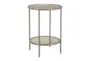 Raegan Bronze 16" Mirror Glass Round Side Table brings mirrored surfaces and a bronze metal frame together to brighten a living room while providing useful surface space. A steel frame in a bronze finish supports a mirrored glass top and a lower mirrored shelf for display and storage, and the compact round footprint fits neatly beside sofas and chairs. Use it as a lamp table or accent surface to add reflected light and easy storage without taking up floor space.