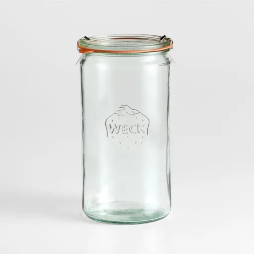 The classic Weck jar goes tall and cylindrical for space-saving storage of pantry staples. The wide-mouth, clear glass container is easy to fill, and the glass lid easily secures with a rubber ring and two metal clamps for a tight seal.