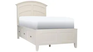 The gentle curves of the Kylie Storage Bed set it apart. From the arched silhouette of the headboard to the boot heel feet, each shapely detail is a graceful accent. The smooth cream finish and round black nickel-finished drawer knobs enhance the simple clean lines of this appealing set.