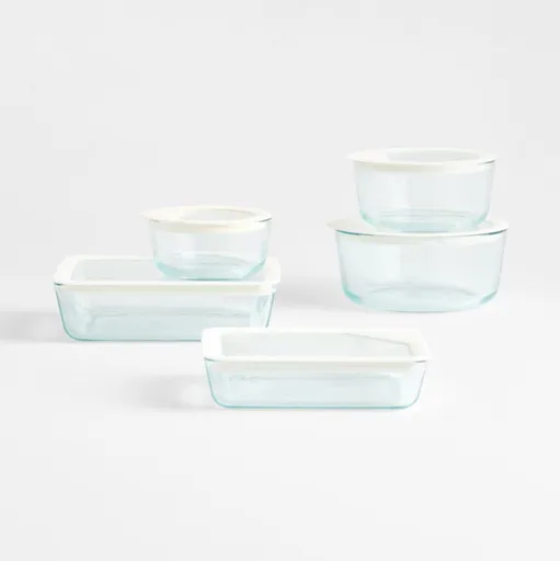 This set's five Pyrex glass bowls store leftovers, fresh produce and pantry items with see-through glass and silicone lids that provide an airtight and leakproof seal. Use the round and rectangular food storage containters to bake, freeze and reheat. The lidded bowls are dishwasher safe for easy cleanup.