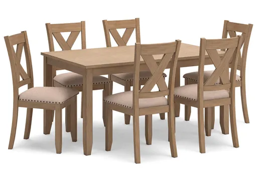 Show off your taste for charmingly curated style with the Sanbriar dining table set. Mastering modern farmhouse flair, the clean-lined design sports neutral seats punctuated by nailhead trim. A light, natural finish inspires delightfully carefree dining.