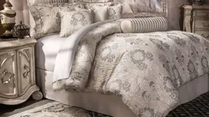 Enhance your sophisticated style with the Sycamore Grove 9-pc. Queen Comforter Set! Defined by tones of warm ivory and soft gray, this look showcases jacquard fabrics that are puffed from a special weaving process that adds dimension and drama. The pillow shams are designed with a tailored flange and are finished with the same twist cord that's seen throughout the set. The coordinating stripe and diamond fabrics on the decorative pillows balance the patterns and tie the whole design together perfectly. The decorative pillows also have feather fill and removable covers for ultimate convenience. Included is 1 comforter, 2 standard shams, 2 euro shams and 4 decorative pillows that are feather filled.