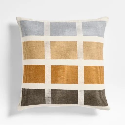 Handwoven of Ethiopian cotton, this pillow frames rectangles of grey, black and tonal tan in ivory to create a grid with graphic punch. The pillow reverses to the same and is neatly tailored with knife edges and a nearly invisible zipper. A plush microfiber insert is included.