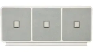 Melange Atlantis Credenza has rounded corners on a rectangle shape, raffia-wrapped door fronts and a creamy white plinth base, sides and front. Dramatic square-shaped hardware is silver-colored metal with white painted glass. The three doors have soft-close hinges and magnetic door catches with one adjustable shelf behind each door, a ventilated back panel and a three-plug electrical outlet behind the middle door. The pale blue tone of the raffia-wrapped doors is inspired by Caribbean beaches.