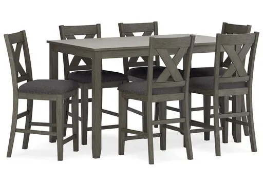 Perfect portion. Striking a simply chic pose, the Caitbrook counter height dining set is crafted with fascinating flair. A subtle gray wash finish gives the clean-lined design a casually cool sensibility. Plushly cushioned seats in a soft, neutral upholstery add to the allure. During casual get-togethers, daily dinners and family game nights alike, this set serves up stylish function.