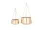 Hang in your garden, office, or living room to add a bright sterling touch to complement your contemporary space. This item ships in 1 carton. These metal planters are great additions to gardens, patios, and indoor spaces with a modern or glam style theme. Iron wall planter makes a great gift for any occasion. A hook at the top of the chains allows for easy hanging from the ceiling; nails and screws are not included. Suitable for indoor and outdoor use. This item ships fully assembled in one piece. Maximum weight limit is 5 lbs. Made in India. Planters do not have drainage holes but they are not watertight. This gold colored wall mounted planter comes as a set of 2. Glam style. This patio piece will elevate your outdoor space.