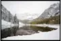 Immerse yourself in the serene beauty of nature with the 38X26 Snow Covered Lake With Black Frame. This rustic piece captures a tranquil winter scene, featuring a snow-covered lake surrounded by majestic mountains and evergreen trees. The soft colors of white, grey, and green blend harmoniously, creating a peaceful and calming atmosphere perfect for any room.