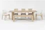 Experience dining in style with the Voyage Natural Rectangular 94" Trestle Dining Table with Bench Wood Back + Upholstered Dining Table Chairs Set for 8 by Nate Berkus + Jeremiah Brent. This modern dining set is perfect for family meals or entertaining guests, offering a combination of comfort and functionality. The natural wood finish adds a touch of warmth to your dining room or kitchen.