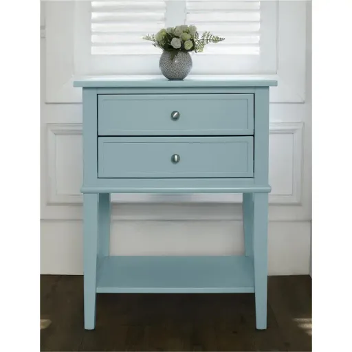 Keep essential items within arm’s reach with the Ameriwood Home Franklin Accent Table with 2 Drawers. The straight lines and beautiful emerald finish of this piece add a pop of color to your space. Made of durable painted MDF and real wood legs, the Accent Table will look great for years to come. Having somewhere to keep your book handy while enjoying a drink after work. Available for Online Purchase Only. Assembly required. This product ships direct from the manufacturer, so RC Willey Delivery is not available.
