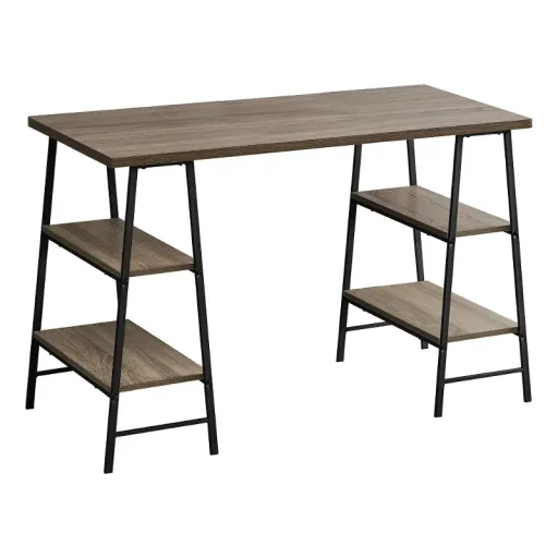 Make your computer desk work as hard as you do. This desk delivers style and functionality from top to bottom, starting with its thick and spacious desktop in a dark taupe wood-look finish. Sawhorse-style legs in black metal are put to work as supports for 4 open shelves that can be used to display books, small storage boxes, or other items. The unique, compact design of this industrial-style writing desk maximizes space and storage potential so that you can maximize productivity. Available for Online Purchase Only. Assembly required. This product ships direct from the manufacturer, so RC Willey Delivery is not available.