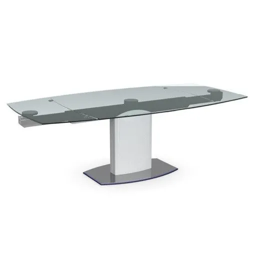 Our Cosmic Dining Extending Table by Calligaris is a stylish table for living dining areas it features a metal sturdy pedestal base and a rectangular glass top with slightly curved edges which can be extended thanks to an automatic device patented by Calligaris. Features Cosmic collection Top material Glass Base material Steel Hardware material Stainless steel Two separately openable side extensions Non-toxic Yes Rust resistant Yes Commercial use Yes Swatch available Yes Water resistant or waterproof Yes General Conformity Certified Yes Seating capacity 8 Warranty 1 Year limited Dimensions 29.6 H x 90.6 W x 47.25 D, 370 lbs.