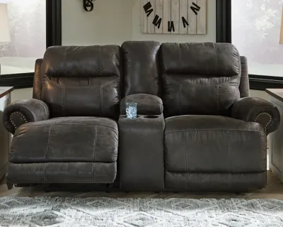 In charcoal gray, the Grearview power reclining loveseat with console and adjustable headrest offers the warm feel of fabric and the cool, rustic look of leather. Caressing you in comfort, the faux leather dual-sided recliner features luxurious bustle back cushions, plus jumbo window-pane stitching and nailhead trim for style. Easy View™ power adjustable headrests offer a primo view of the TV even when you're fully reclined, to enhance your relaxation. Chill out while you recharge thanks to a USB port built right into the one-touch power control. For added convenience, the center console includes 2 cup holders and a hidden storage compartment.