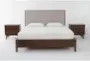 Transform your bedroom with the Draper Brown California King Storage Wood & Upholstered 3 Piece Bedroom Set. This mid-century modern set features a platform bed with ample side storage and two 4-drawer nightstands. The walnut-colored wood and boucle fabric headboard add a touch of sophistication and comfort to your sleeping space.