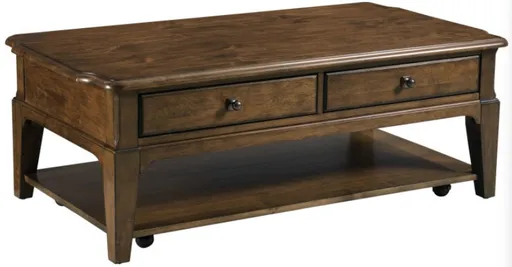 At 52 inches long, the Washburn rectangular coffee table is one of two coffee table shapes available in the Commonwealth living room table assortment. It includes two drawers and a large shelf for a little added storage where you need it and it also comes with removable casters.