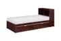 The Kory Cherry Brown Twin Wood Bookcase Bed with Underbed Storage Boxes is a perfect addition to any kid's bedroom. This traditional style bed features a rich dark cherry finish that adds warmth and charm to the room. Made from solid pine wood, it offers durability and a timeless look.