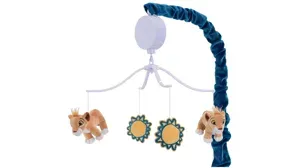 Your little one will love watching the Lion King Adventure Musical Crib Mobile circle overhead, while playing Brahms Lullaby, Twinkle Little Star, and Rock-A-Bye Baby. A blue scrunchie covers the mobile arm. The musical mobile plays for 20 minutes, has an on/off switch and volume control. Mobiles should be placed out of arms reach for your baby. Requires 3 AAA batteries not included.