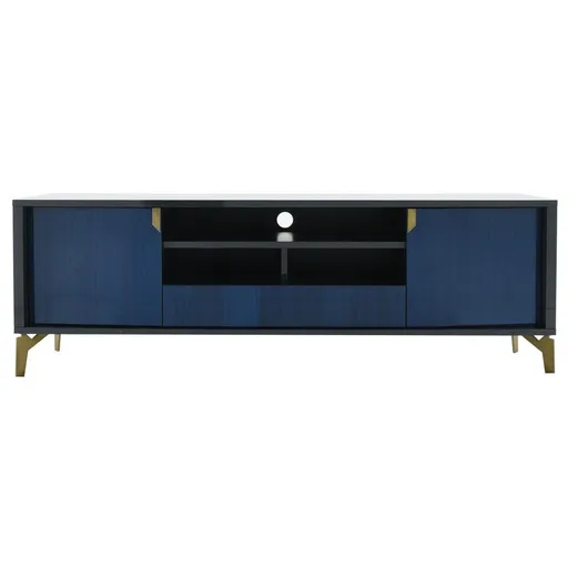 Achieve that high-end viewing experience with the Sapphire TV Stand. Made of eucalyptus veneers, this Italian piece is inspired by the art deco era with its antique brass accents, asymmetrical handles and angled metal legs. The gold details contrast its glossy blue finish beautifully, making it the perfect stand to show off your 80-inch flat screen. Modern and convenient, this piece features plenty of open display space, two cabinets and one soft-closing drawer with ball-bearing glides. Storage spaces boast fully finished interiors and wire management cutouts for extra ease and zero clutter.