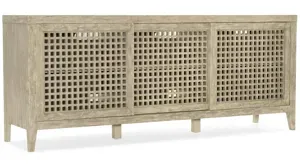 With a romantic French laundry and Shabby Chic appeal, the Cia Bella entertainment console will star in your family room with its Flaky White finish with hand wire brushing over light and airy perforated doors. Crafted of Poplar and Hardwood Solids with Maple Veneers, the console has 3 sliding doors with one adjustable shelf behind each door, a ventilated back panel, 3-plug outlet and accommodates up to an 80- inch TV.