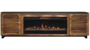 Our Reah 86" fireplace console is cultured and chic, with a modern Hollywood appeal as classic as Elvis himself. This two toned stunner with slatted doors would have been a hit down in the jungle room. It holds up to a 98" TV and has plenty of storage for media gear to entertain the night away with your favorite Elvis movie. The house warming 42" fireplace insert has clear crystals and traditional log set with embers to keep you toasty while binge watching your favorite TV show or movie.