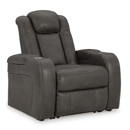 The Fyne-Dyme Shadow Power Recliner brings modern style and high-tech comfort to your living space. Wrapped in gray faux leather with diamond stitching and streamlined arms, it offers one-touch power reclining, adjustable headrests, and plush foam cushions for lasting support. Flip-top storage arms with cup holders keep essentials close, while ambient blue LED base lighting sets the mood for movie nights or gaming. Designed with a sturdy frame and energy-saving USB technology, it’s the perfect blend of function, durability, and sleek sophistication.