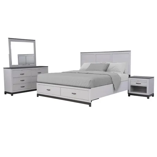 Consider your bedroom furniture shopping complete! The Charlotte 4-Piece King Bedroom Set has the whole kit and caboodle. This impressive wooden set includes nine total storage drawers between the bed, dresser and nightstand. With a king platform bed, dresser, night stand and mirror — all of which boast a modern look and two-tone combination — this set has every piece of the decor puzzle.