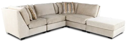 Clean-lined and inviting, the Daniel collection brings laid-back, sophisticated style to your home. This 5-piece sectional's streamlined silhouette is covered in velvety soft desert sand fabric, with plush yet supportive cushions providing ultimate comfort. Its truly modular design, consisting of two corner chairs, two armless chairs, and a peninsula ottoman, means you can configure the sectional to best suit your unique space! Includes 2 armless chairs, 2 corner chairs, and ottoman.
