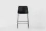 The Cobbler Black 26" Faux Leather Bucket Seat With Baseball Stitch Counter Height Stool With Back offers a comfortable and stylish seating solution for your dining room or kitchen. Its modern design features a sleek black faux leather bucket seat with intricate baseball stitching, providing both durability and sophistication. The sturdy metal legs ensure stability, making it perfect for high-traffic areas.