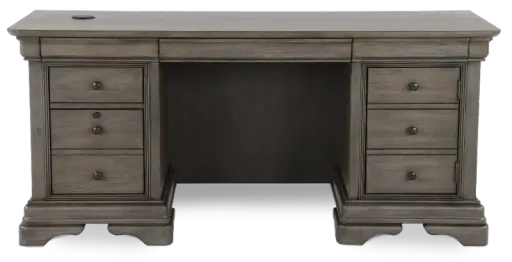 Part of the Sinclair collection, this traditional 68 inch credenza features a stately style, timeless design, and calming ash gray finish. Get work done at home without sacrificing style with this desk credenza that has features to help you stay productive. The fold-out keyboard tray, felt-lined drawers, and cord management system are just some of the great features of this desk!