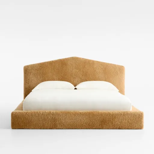 Our Tucker bed goes low and cozy in soft shearling. An adult version of our popular kid's bed, it plays with proportion and line in low-slung rails and a graphic pyramid-angled headboard. The plush feel and cuddly comfort of natural shearling upholsters the amply cushioned frame on all sides, including the back, so the bed can float in the bedroom.