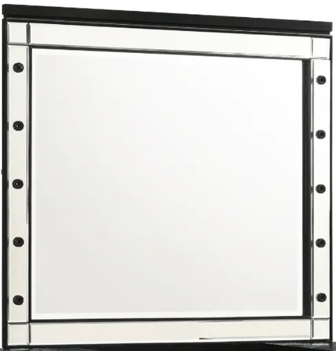 The Valentino vanity dressing table mirror in timeless blacka testament to enduring craftsmanship crafted from a blend of manufactured and solid woods, adorned with exquisite embossed inlays. Designed for use with the matching vanity table and radiating with glitz and glam.